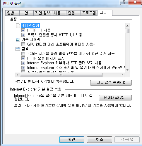 위 3가지 방법을 모두 사용해도 문제가 해결되지 않을 경우 인터넷 익스플로러 기본 설정 복원을 합니다.