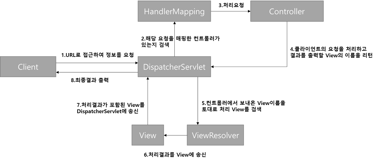 - 처리결과가 포함된 view를 DispatcherServlet에 전달