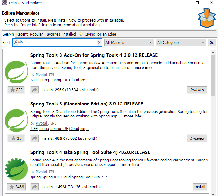 3. market에서 sts를 입력합니다. 아래의 3가지 중에 원하시는 버전을 인스톨하여 사용하시면됩니다.