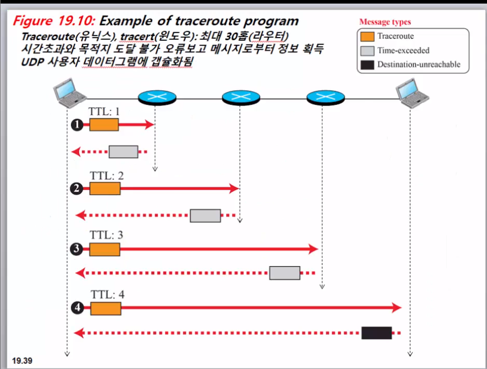7. 메시지는 첫 번째 라우터에서 폐기되며, 시간초과 ICMP 오류 메시지 전송되고 traceroute 프로그램은 처음 라우터의 IP주소와 메시지의 데이터 영역에서 라우터 이름을 검색할 수 있다.