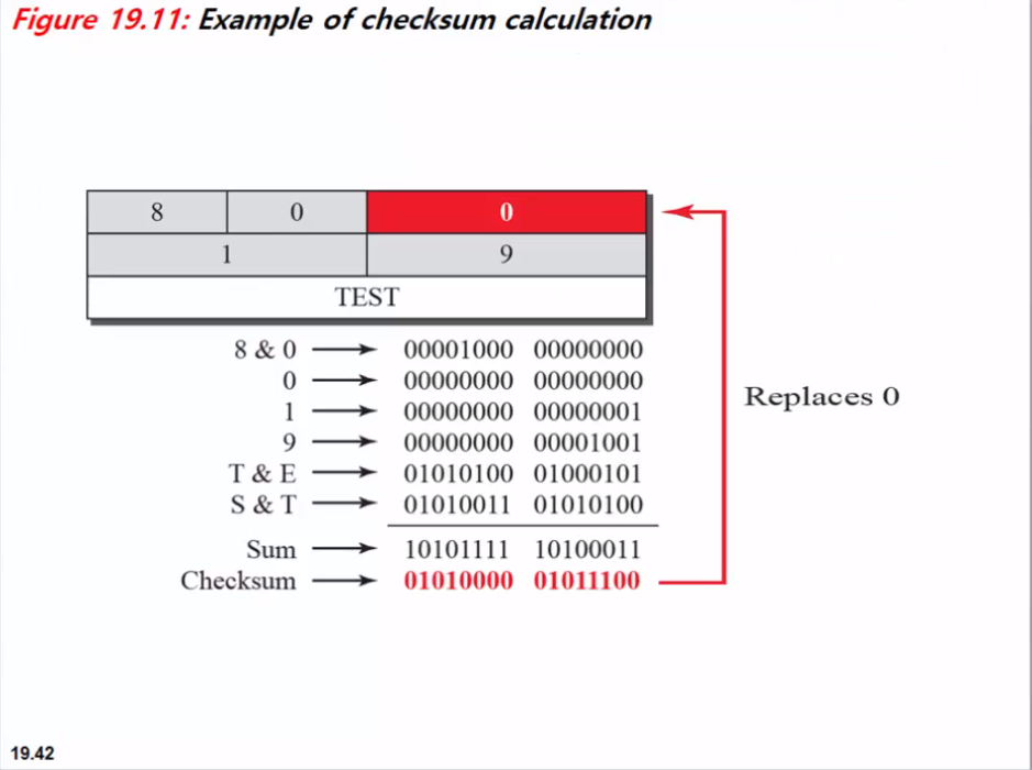 그림 19.11은 간단한 에코 요청 메시지에 대한 체크섬 계산의 예를 보여줍니다.