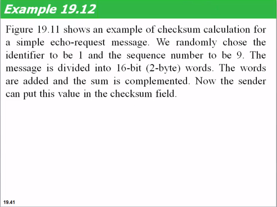 그림 19.11은 간단한 에코 요청 메시지에 대한 체크섬 계산의 예를 보여줍니다.