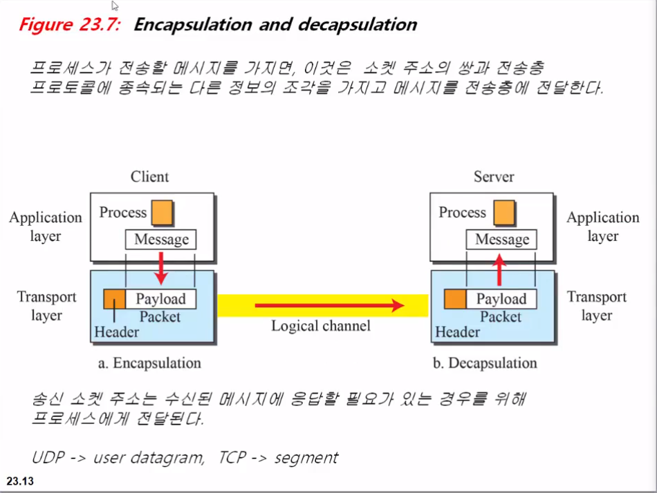 역캡슐화 : 상대방에서 논리적 채널을 이용하여 보낸 메시지를 전송층에서 받고 전송층이 payload에 저장된 메시지를 어플리케이션층으로 보내는 방법을 역캡슐화라고 한다.