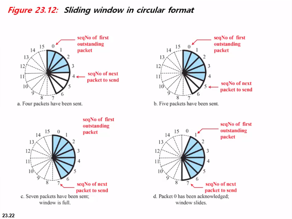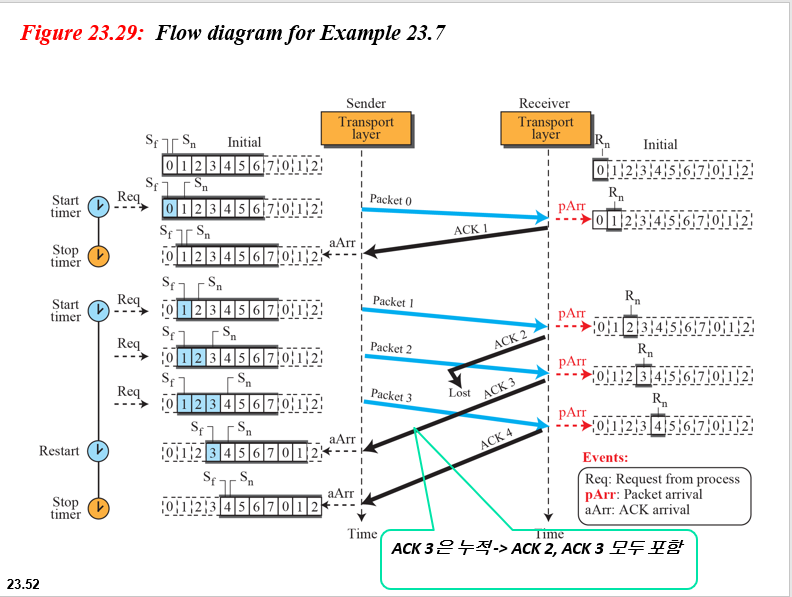 그림 23.30은 패킷이 손실 될 때 발생하는 상황을 보여줍니다. 패킷 0, 1, 2 및 3이 전송됩니다.