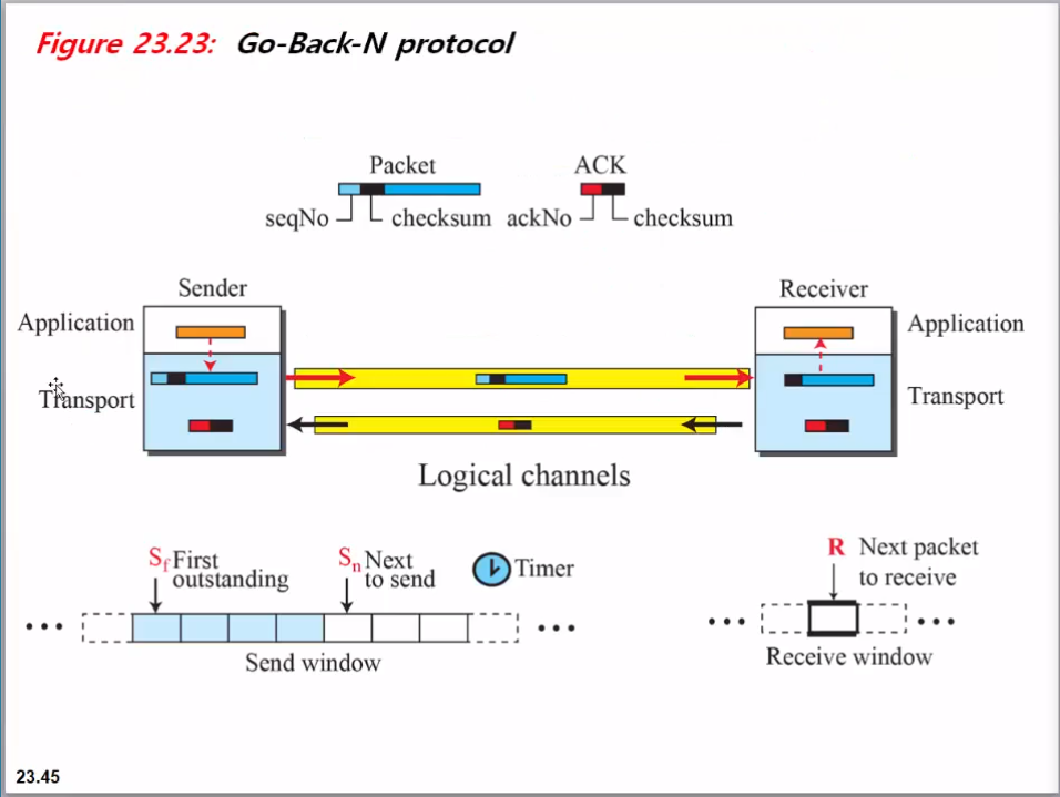 그림 23.29는 Go-Back-N의 예를 보여줍니다.