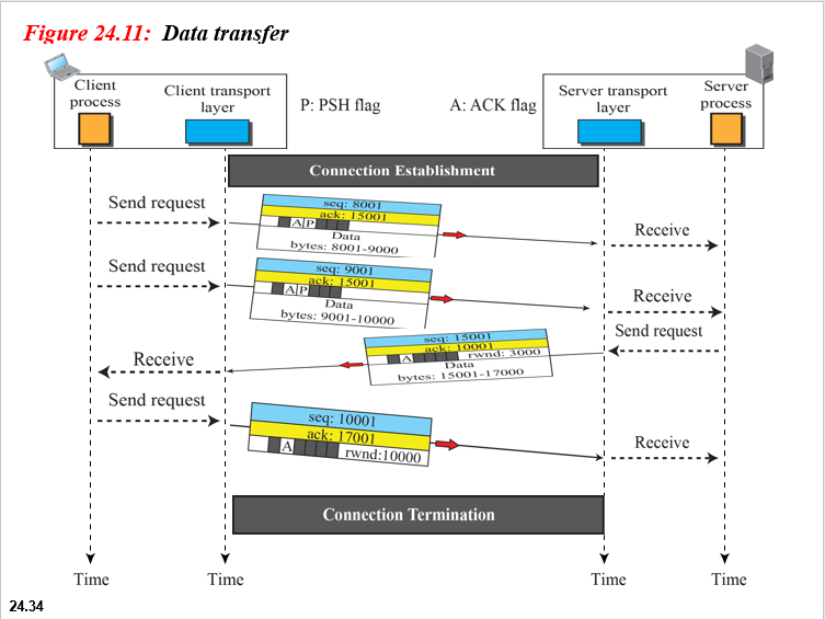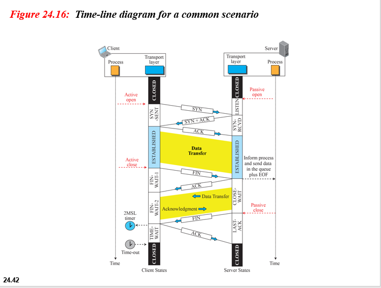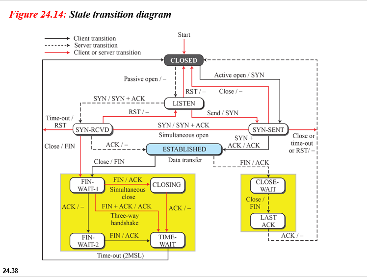 연결 설정, 연결 종료 및 데이터 전송 중에 발생하는 모든 다른 이벤트를 추적하기 위해 TCP는 그림 24.14와 같이 FSM (Finite State Machine)으로 지정됩니다.
