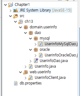 - 환경파일(db.properties)에서 database의 종류에 대한 정보를 읽고 그 정보에 맞게 dao 인스턴스를 생성하여 실행될 수 있게 함